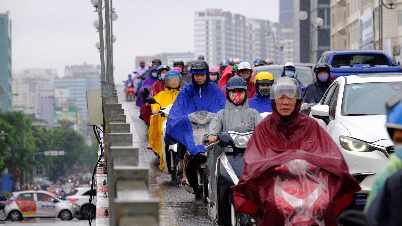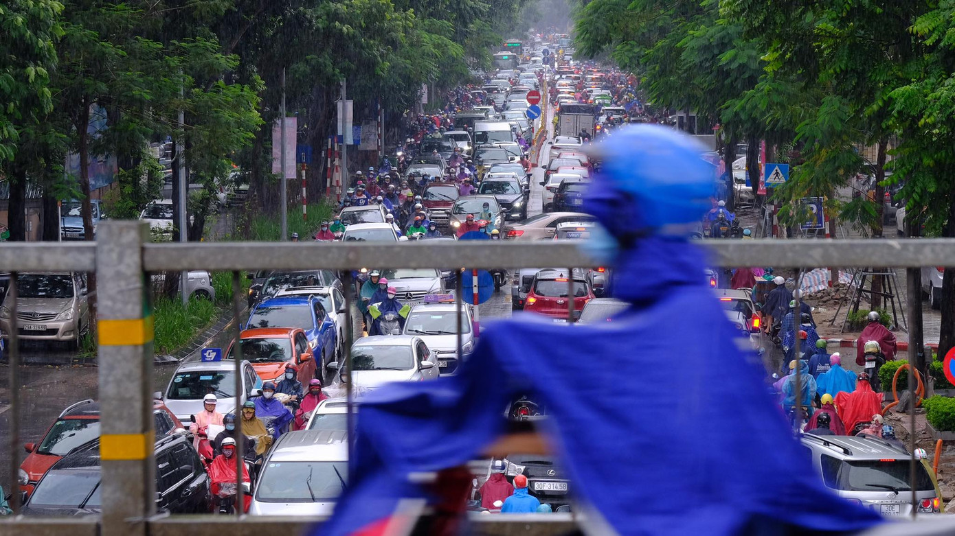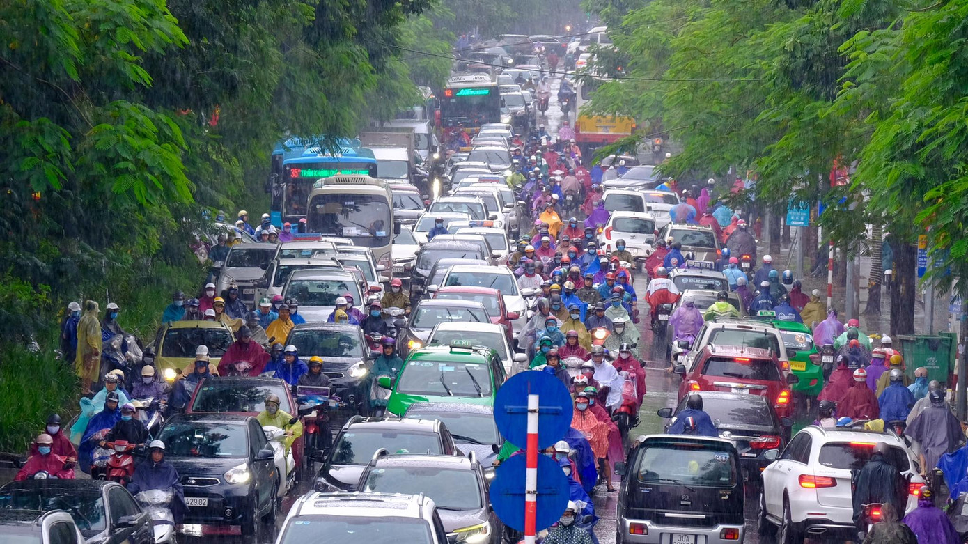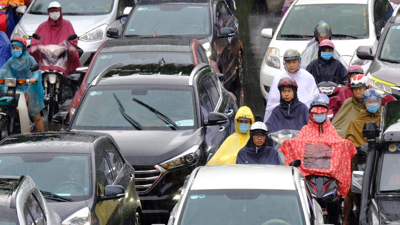 Người và xe "chôn chân" tại chỗ dưới cơn mưa
