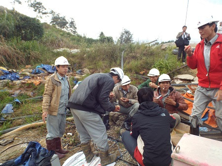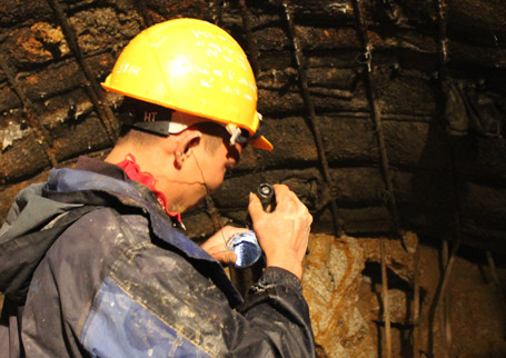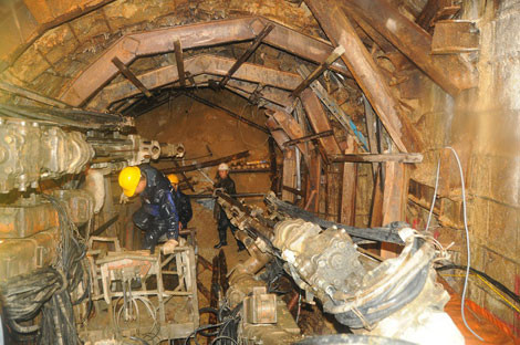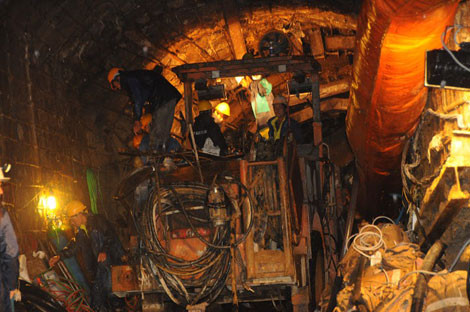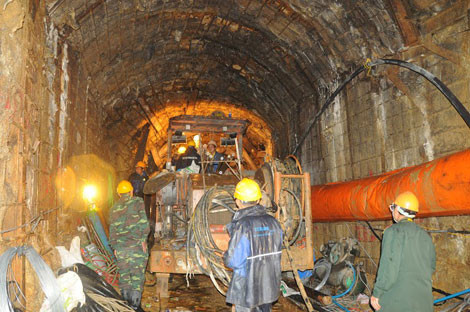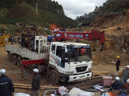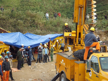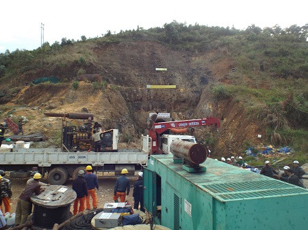Lực lượng cứu hộ đang tiến hành khoan thông đường hầm. Tuy nhiên, do kết cấu địa chất rất phức tạp nên đã gặp phải rất nhiều khó khăn. Ảnh: CAND