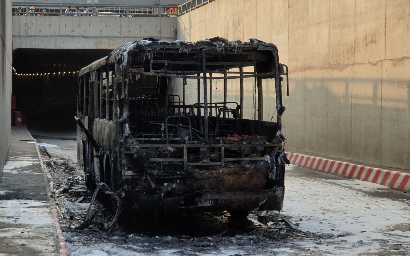 Khi đang chạy vào hầm chui An Sương thuộc phường Trung Mỹ Tây, quận 12, TPHCM, lửa bùng phát từ đầu xe. Lập tức, tài xế dừng xe, cùng tiếp viên thoát ra ngoài. Ngọn lửa nhanh chóng bao trùm thân xe, kèm cột khói đen bốc nghi ngút.