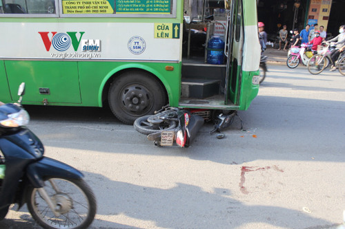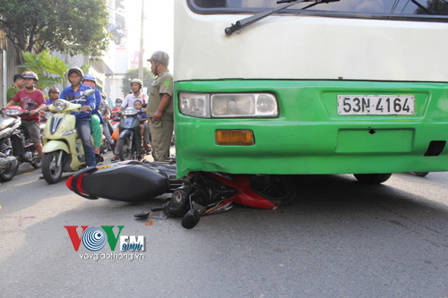 Khoảng 7h00 hôm nay (25/11), nam thanh niên khoảng 22 tuổi chạy xe máy biển số 62V1 – 8589 trên đường Hòa Bình hướng từ đường Lũy Bán Bích về Ngã tư Bốn Xã. Khi vừa đến trước địa chỉ nhà số 182 Hòa Bình, phường Hiệp Tân, quận Tân Phú, Tp. HCM thì bị xe buýt biển số 53N – 4164 chạy cùng chiều phía sau đâm mạnh. Nam thanh niên bị hất văng xa hơn 2 mét trên đường bị thương rất nặng. Chiếc xe máy của nạn nhân bị cuốn vào gầm xe buýt kéo lê trên đường.