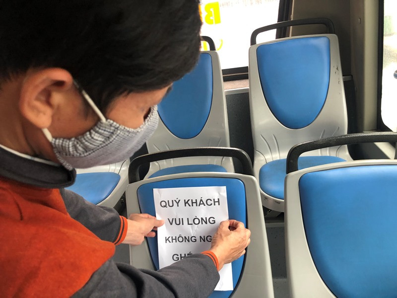 Với những xe lượt đầu được huy động ra tuyến, nhân viên giám sát thường lên sớm để dán thông báo cho các vị trí hành khách không được ngồi để phòng dịch