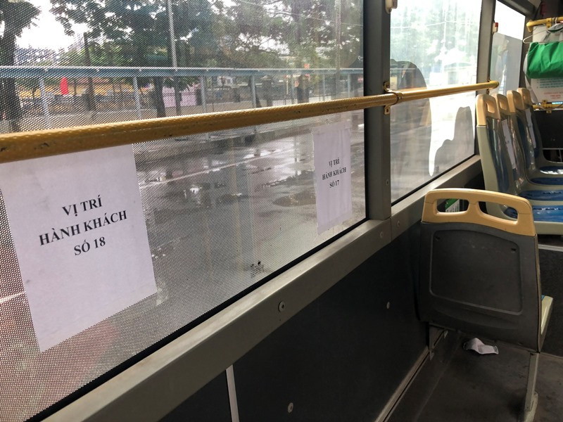 Với các vị trí đứng trên xe, hành khách cũng được dán thông báo để đứng đúng vị trí cách xa nhau.