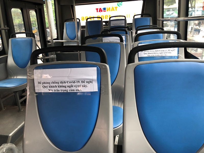 Để giãn cách phòng dịch theo quy định, các ghế trên xe được dán thông báo để khách không ngồi vào