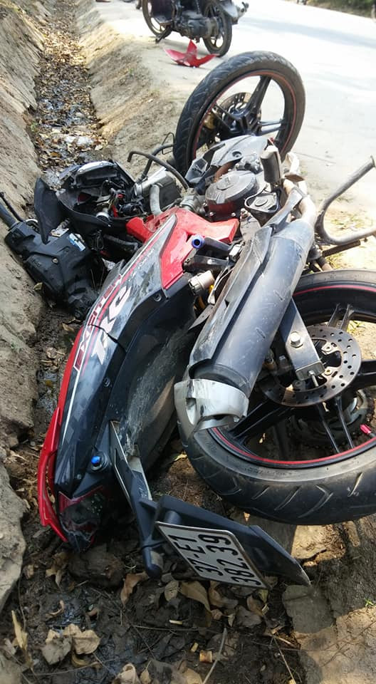 Tại hiện trường, một xe máy nằm trong gầm xe buýt, chiếc xe máy còn lại văng xa hàng chục mét, hư hỏng nặng. Phần đầu xe máy vỡ nhựa, vương vãi trên đường. Chiếc xe buýt lao đến trước cửa nhà dân thì dừng lại.