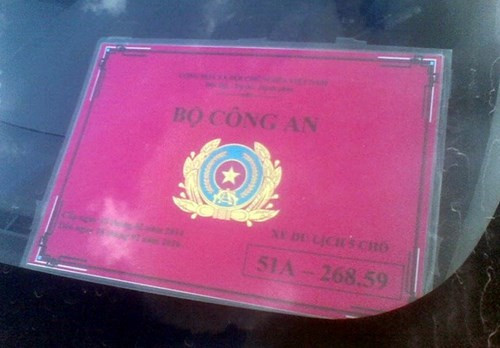 Phía trước kính xe là một bảng đỏ được ép nhựa ghi dòng chữ Bộ Công an. Phía dưới là biểu trưng của ngành Công an nhân dân.