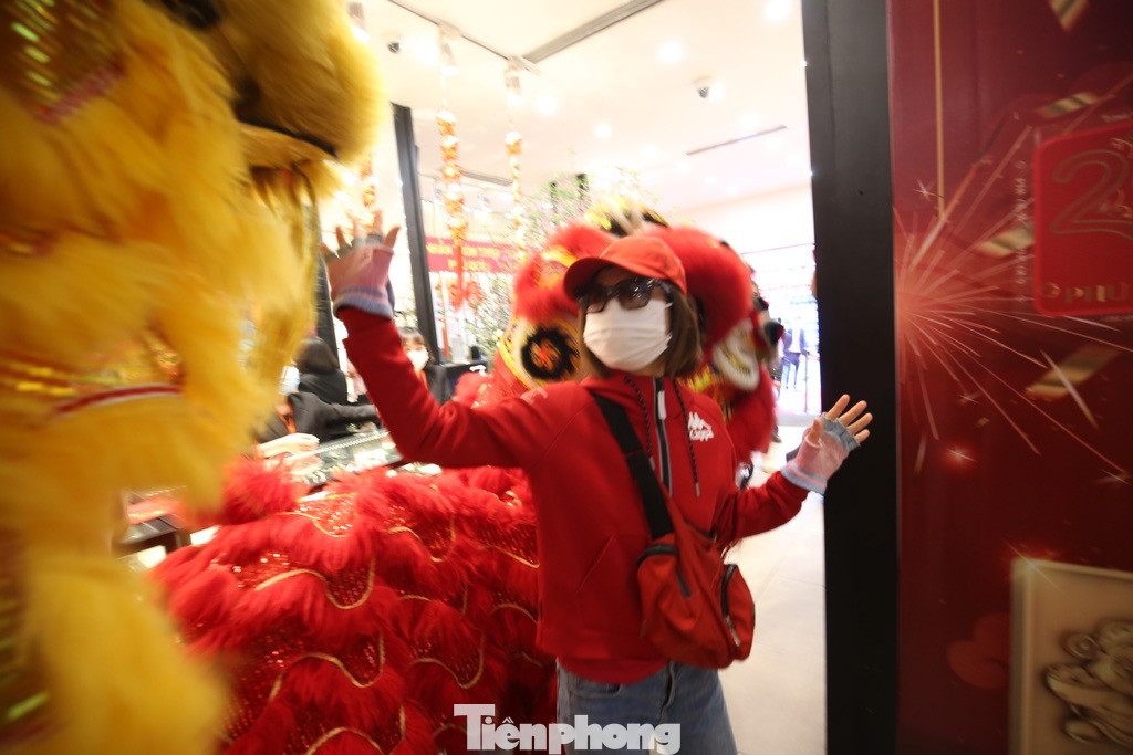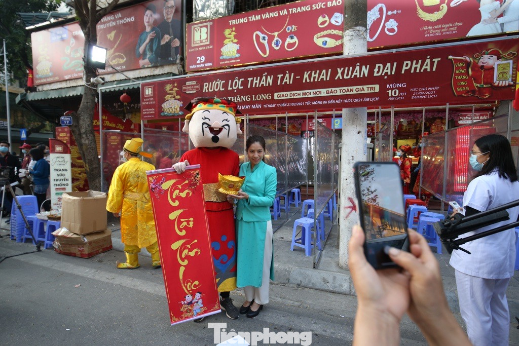 Sau khi mua được vàng, nhiều người đứng cạnh ông thần tài để chụp hình lấy may mắn trong năm.