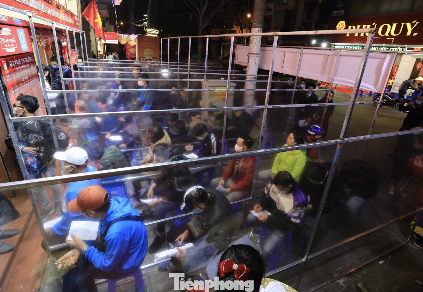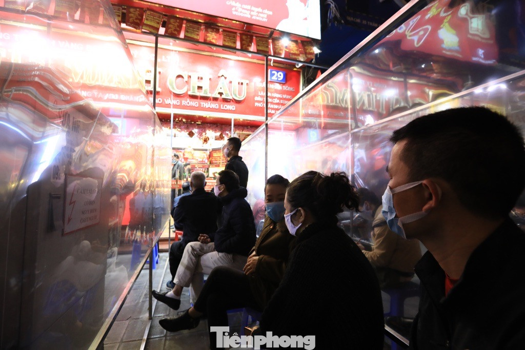 6 giờ sáng nay 21/2 ,người dân ngồi xếp hàng theo vách ngăn do cửa hàng vàng Bảo Tín Minh Châu bố trí tạo khoảng cách phòng chống dịch cho người đến mua vàng.