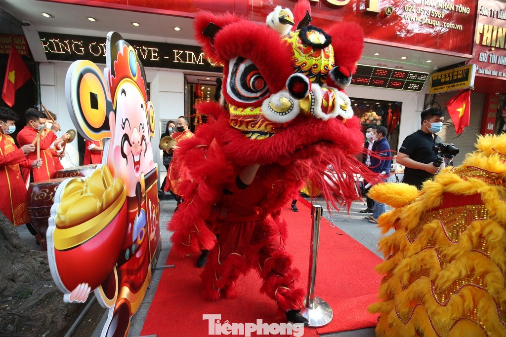 Một vị khách hàng vui tươi khi đến một tiệm vàng mới mở với những chú lân đang múa chào đón khách hàng.