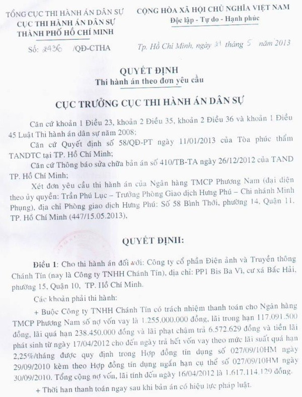 Trong bản scan Quyết định thi hành án được ông Quân Anh đăng tải trên trang cá nhân thì Cục Thi hành án Dân sự đã cho phép Ngân hàng Phương Nam phát mãi căn nhà thuộc sở hữu của gia đình ông - tài sản thế chấp để công ty Chánh Tín vay tiền - để thu hồi nợ.