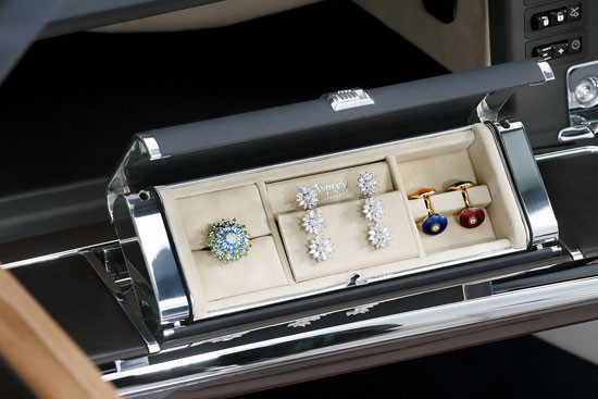Tuy nhiên, điểm nổi bật nhất của chiếc siêu xe phiên bản độ lần này là bộ sưu tập đồ trang sức đi kèm của hãng Asprey được “giấu” khéo léo bên trong ngăn để đồ phía trước. Các nhân viên của Rolls-Royce cho biết họ đã mất hai ngày làm việc liên tục để hoàn thành tác phẩm trên.