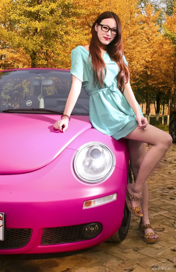 TPO - Cô gái với cặp chân dài miên man, thân hình mảnh khảnh và làn da trắng như tuyết tạo dáng đầy màu sắc bên chiếc xe Volkswagen New Beetle phiên bản convertible màu hồng dành riêng cho phái nữ.