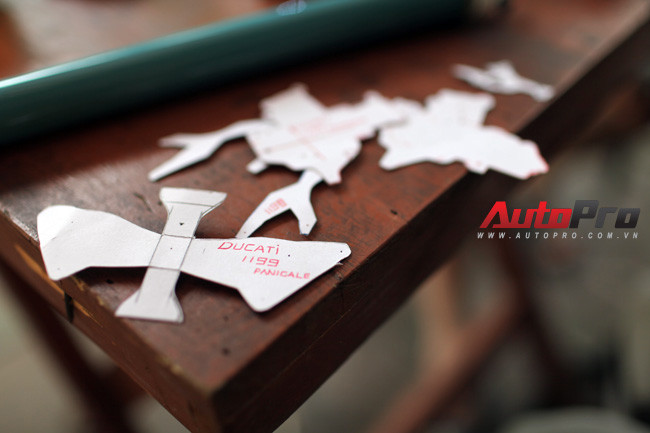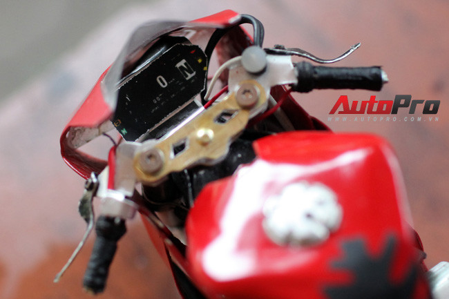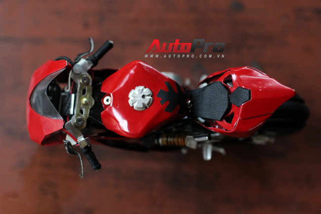 Sau khi hoàn thiện các chi tiết riêng lẻ, Long lại phải tỉ mỉ dán từng chi tiết lại với nhau bằng keo hoặc bắt các chốt bằng ốc vít. Cuối cùng, khi chiếc xe đã được dựng hoàn thiện, Long phải sử dụng sơn phun để sơn màu cho chiếc xe cũng như tạo những nét nhấn nhá về tem xe bằng việc in decal Ducati 1199 Panigale dán lên thân xe.