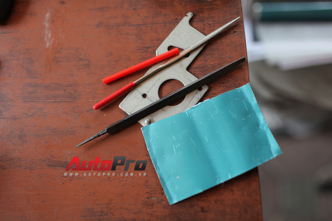 Sau đó, Long lại tiếp tục “can” các chi tiết từ giấy pơ-luya lên bìa cứng để làm phôi vẽ lên các miếng nhôm lấy từ trống mực máy in. Và cuối cùng, Long tiến hành cắt thủ công các miếng nhôm để tạo ra các chi tiết cho chiếc xe của mình.