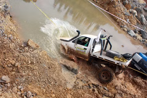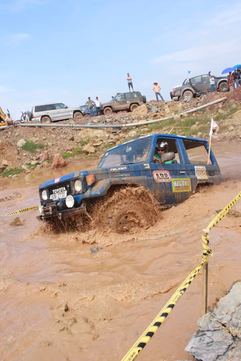 | Chiếc xe của nhà vô địch lội nước trong một bài thi. |