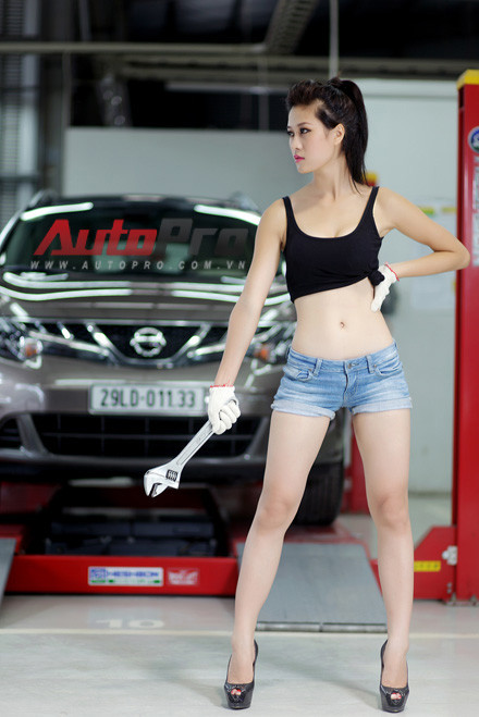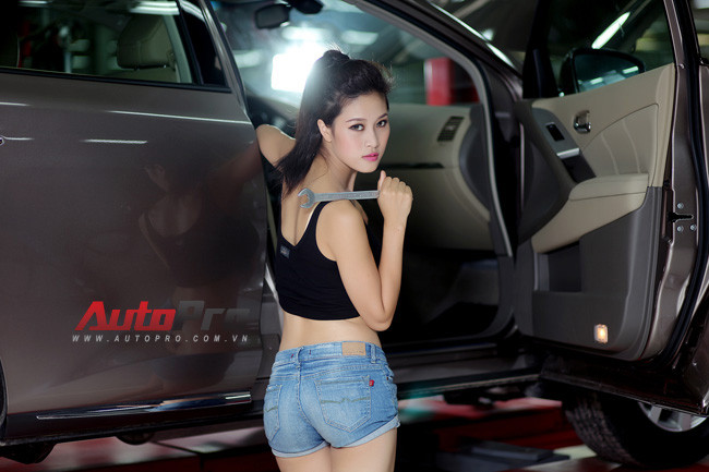 Không gian gara sữa chửa xe trở nên bừng sáng với sự xuất hiện của 2 cô nàng sửa xe nóng bóng.
