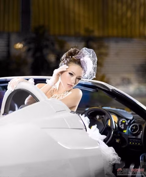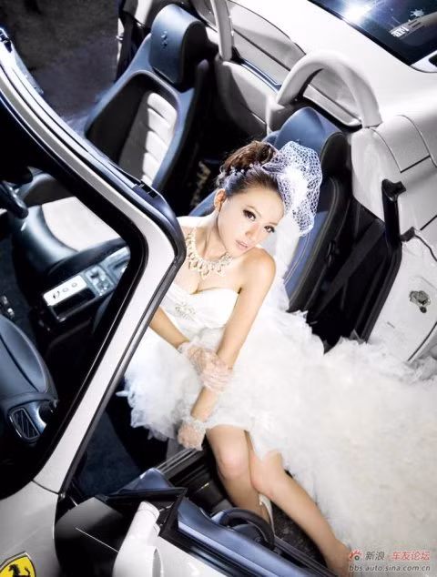 TPO - Người đẹp trong trang phục cô dâu với váy trắng lộng lẫy kiêu sa tự tin khoe dáng bên cạnh "ngựa chiến" Ferrari mui trần.
