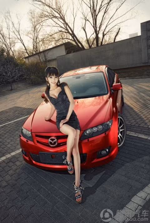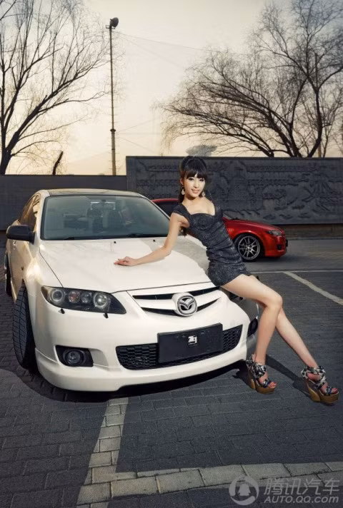 TPO - Cô người mẫu sở hữu làn da trắng, đôi chân dài và khuôn mặt khả ái tự tin khoe dáng bên chiếc sedan của Mazda.