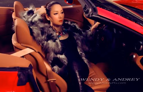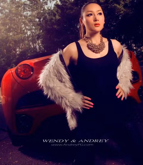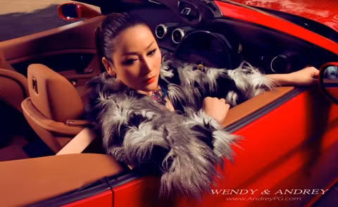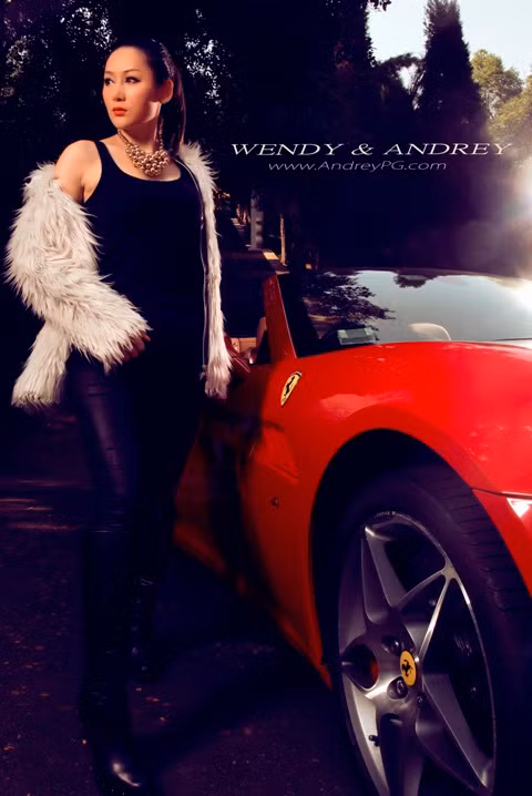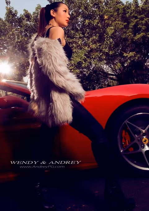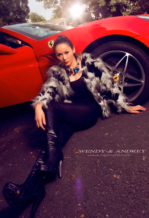 TPO - Cô người mẫu với khuôn mặt khả ái và đôi chân dài tự tin đọ dáng cùng chiếc mui trần thể thao Ferrari đỏ chót.