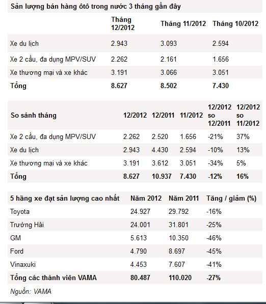 TPO - Hiệp hội các Nhà sản xuất ôtô Việt Nam (VAMA) cho biết, tổng sản lượng bán hàng trên toàn thị trường năm 2012 chỉ đạt 92.584 chiếc, giảm đến 33% so với năm trước đó.