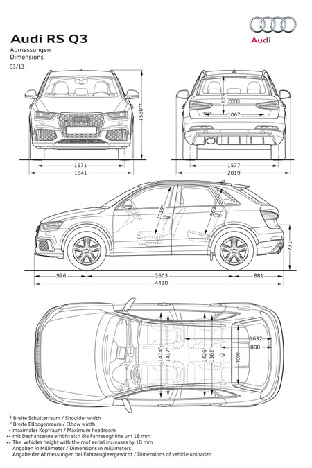 So với bản concept từng ra mắt tại triển lãm ô tô Bắc Kinh 2012, phiên bản sản xuất của RS Q3 chỉ có một số thay đổi nhỏ, như các phần làm từ sợi các-bon trong và ngoài xe được thay thế bằng nhôm hoặc nhựa tổng hợp đen, và động cơ xăng 2,5 lít tăng áp sản sinh công suất tối đa 306 mã lực, giảm so với 350 mã lực công bố trước đây.