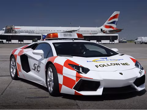Lamborghini Aventador làm nhiệm vụ dẫn đường từ sân đỗ máy bay ra đường băng cất cánh cho các máy bay tại sân bay này.