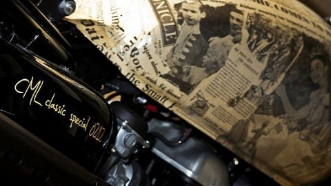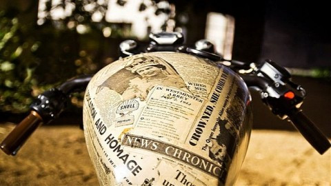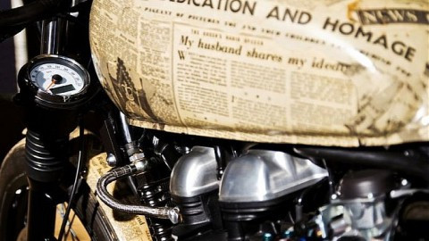 Mattia đã tỉ mỉ lựa chọn những hình ảnh trên những tờ báo lớn của Anh vào 60 năm trước, và vẽ lên trên bình xăng chiếc Triumph.