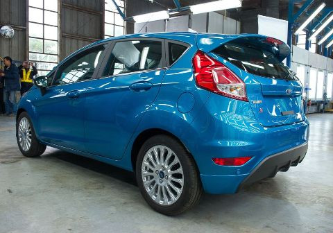 Chiếc xe Fiesta hatchback 5 cửa màu xanh dương và chiếc sedan 4 cửa mới màu trắng đã đánh dấu thời điểm bắt đầu sản xuất Fiesta mới.