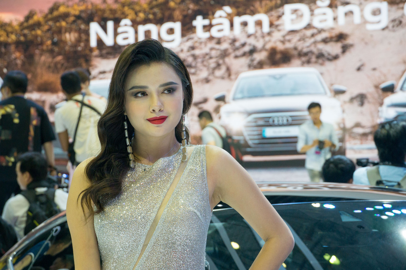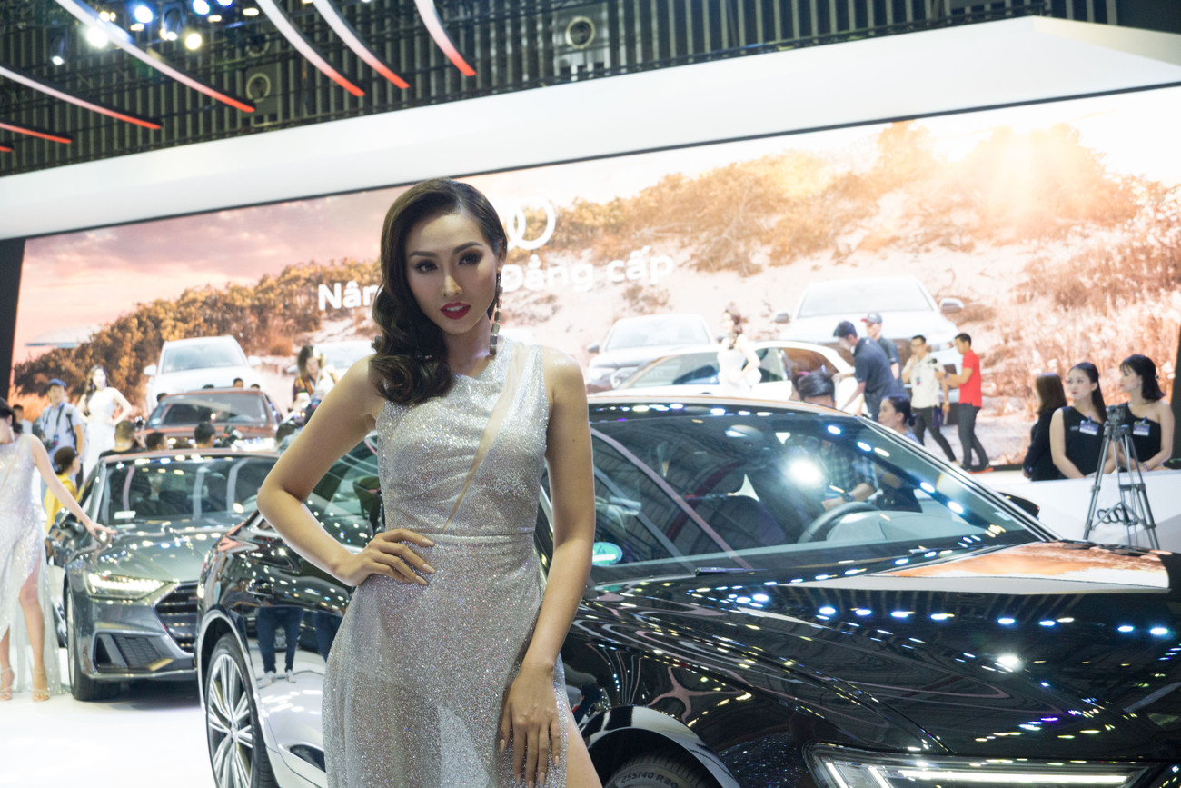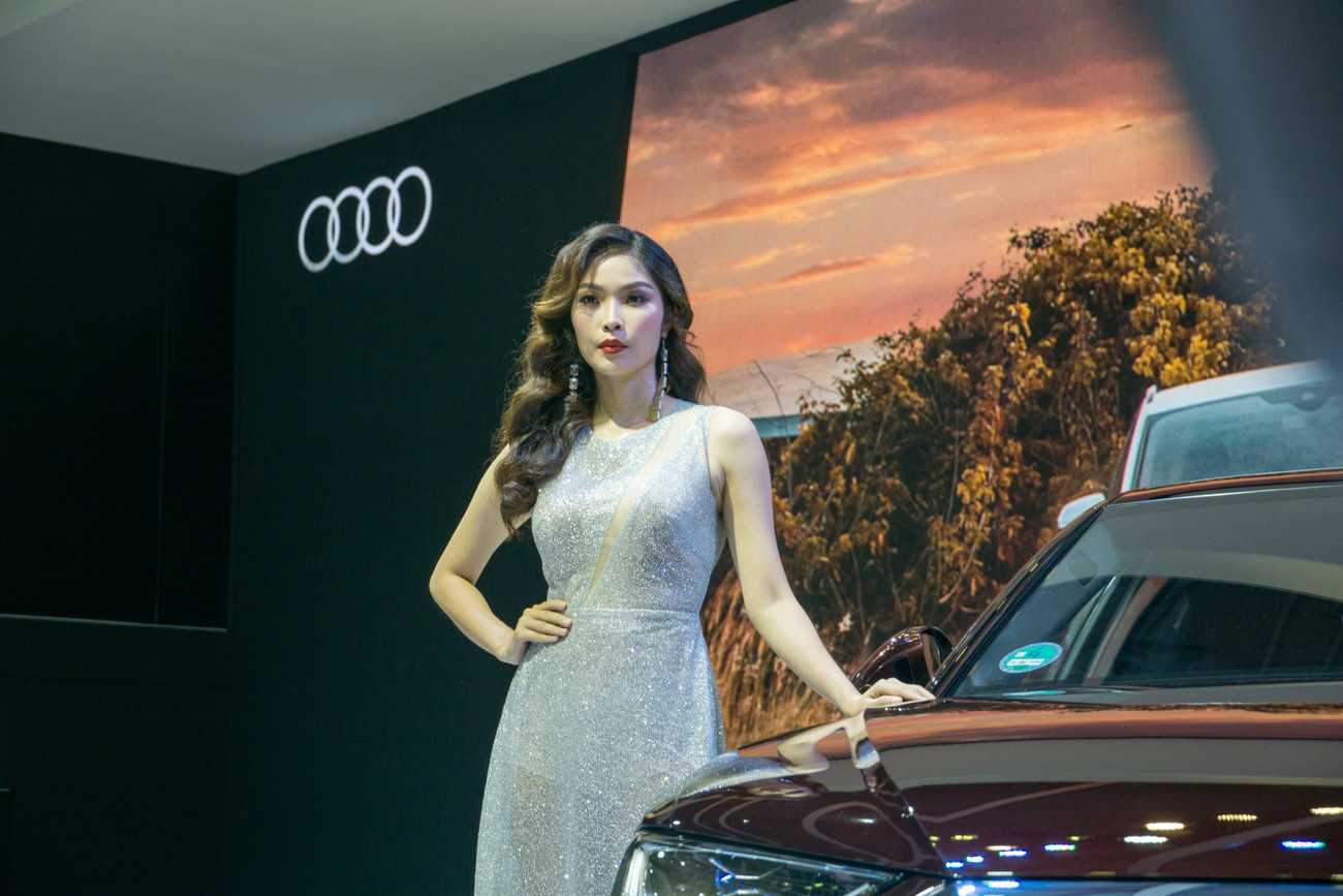 Trưng bày hàng loạt mẫu xe mới, Audi cũng mang đến loạt dàn "chân dài" đông đảo với những chiếc đầm lấp lánh.