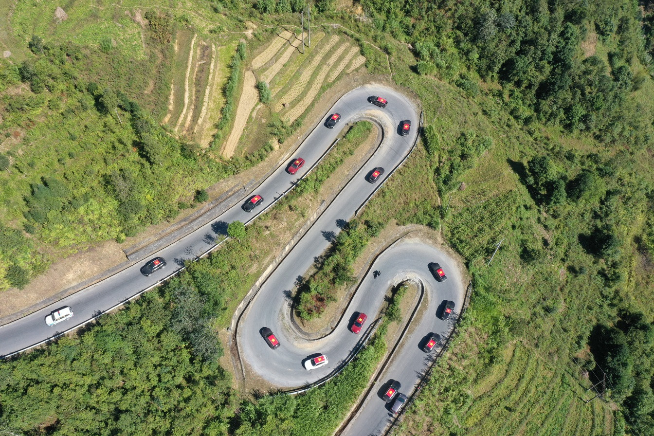 Tới cung đường từ Phố Cáo về Sủng Là, đoàn caravan gần 100 xe VinFast qua dốc Chín Khoanh với rất nhiều khúc cua chữ U cực kì đặc sắc của vùng cao Hà Giang