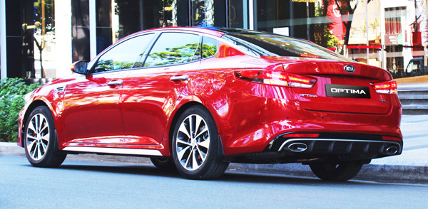 Vì nhắm vào đối tượng khách hàng thành đạt, tự tin nên thiết kế của Kia Optima mới đáp ứng tiêu chí vừa sang trọng vừa cá tính nhưng vẫn trẻ trung, năng động. Phần đầu xe, Optima mới tạo ấn tượng mạnh mẽ với lưới tản nhiệt liền khối với cụm đèn pha cùng đường viền mạ chrome lấy ý tưởng từ hình ảnh đôi cánh dang rộng của loài đại bàng thể hiện sự phóng khoáng, tập trung cao độ, chuyển động mạnh mẽ. Cản trước được thiết kế lớn kéo dài sang hai bên cùng với hốc lấy gió, cải thiện tính khí động học và tăng tính thể thao cho chiếc xe. Đuôi xe, Optima mới được thiết kế hài hòa tinh tế và đầy cá tính với cụm đèn hậu vuốt dài liền mạch với thân xe. Dải đèn LED là hai đường chạy song song giúp xe thêm phần hiện đại, tinh tế. Cụm đèn sau với thiết kế mỏng, vuốt dọc suốt đuôi xe thể hiện sự hiện đại và tinh tế kết hợp với đèn báo rẽ; đèn hậu, phanh; đèn báo lùi, cản sau.