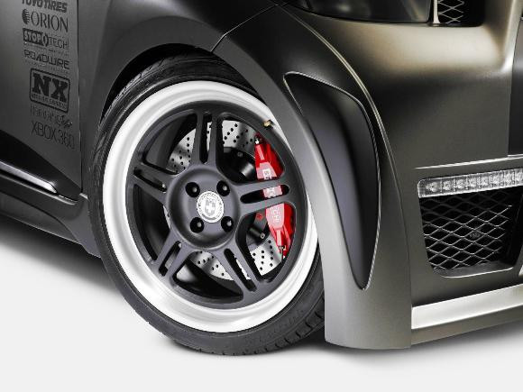 Với dẫn động cầu sau, hứa hẹn Tatsu’s iQ-MR sẽ là một chiếc xe biểu diễn drift độc đáo. Ngoại thất chiếc xe cũng được nâng cấp, đẹp mắt và sang trọng hơn nhờ những tấm ốp được thiết kế bởi Speciality Cars. Bộ la-zăng hoa lá rất bắt mắt được giữ màu kim loại, rất hợp với ánh kim từ đầu đến đuôi xe.