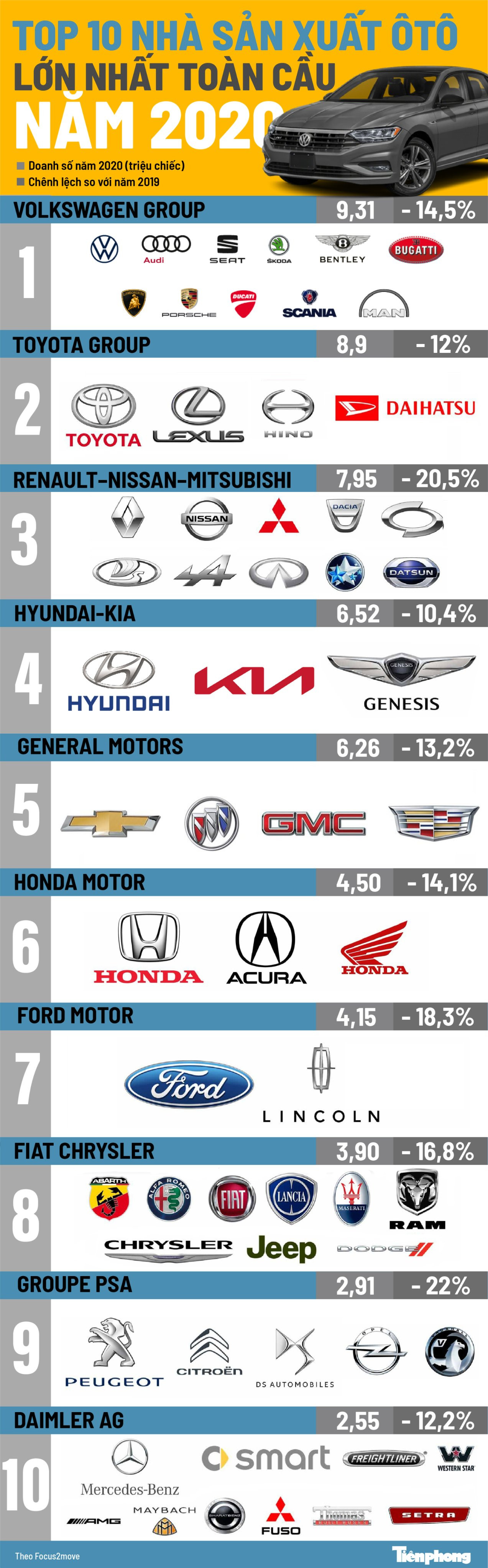 TPO - Đây là danh sách 10 nhà sản xuất ôtô lớn nhất thế giới năm 2020 tính theo doanh số bán ra, mỗi nhà sản xuất đều sở hữu nhiều thương hiệu của riêng mình.