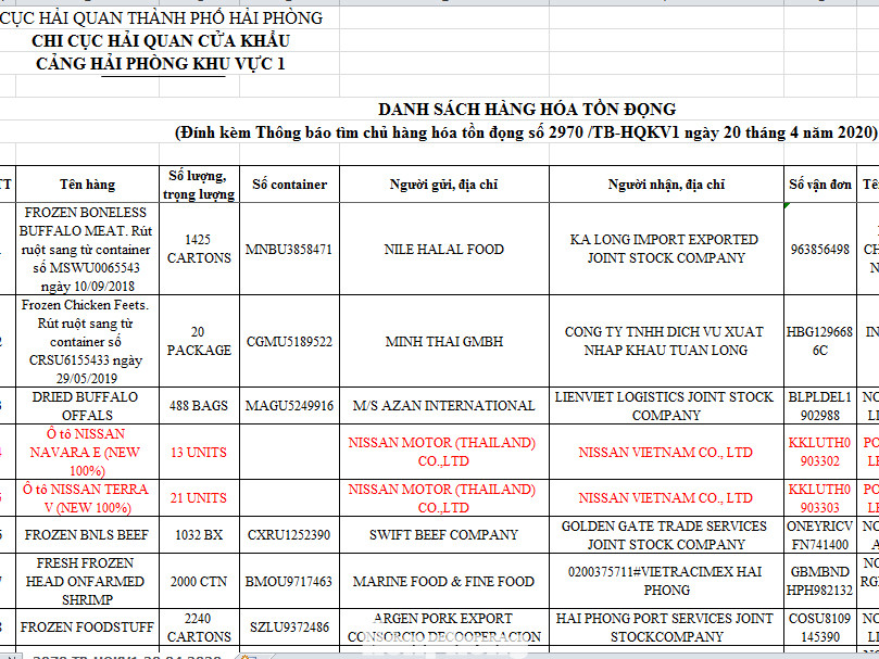 Trước đó, như Tiền Phong đưa tin, ngày 20/4, Chi cục Hải quan cửa khẩu cảng Hải Phòng khu vực I (Cục Hải quan TP. Hải Phòng) thông báo tới các tổ chức, cá nhân có liên quan đến 25 lô hàng tồn đọng đang lưu tại cảng Tân Vũ, 9 lô hàng tồn đọng đang lưu giữ tại cảng PTSC Đình Vũ, 9 lô hàng lẻ tồn đọng đang lưu giữ tại cảng Hoàng Diệu.
