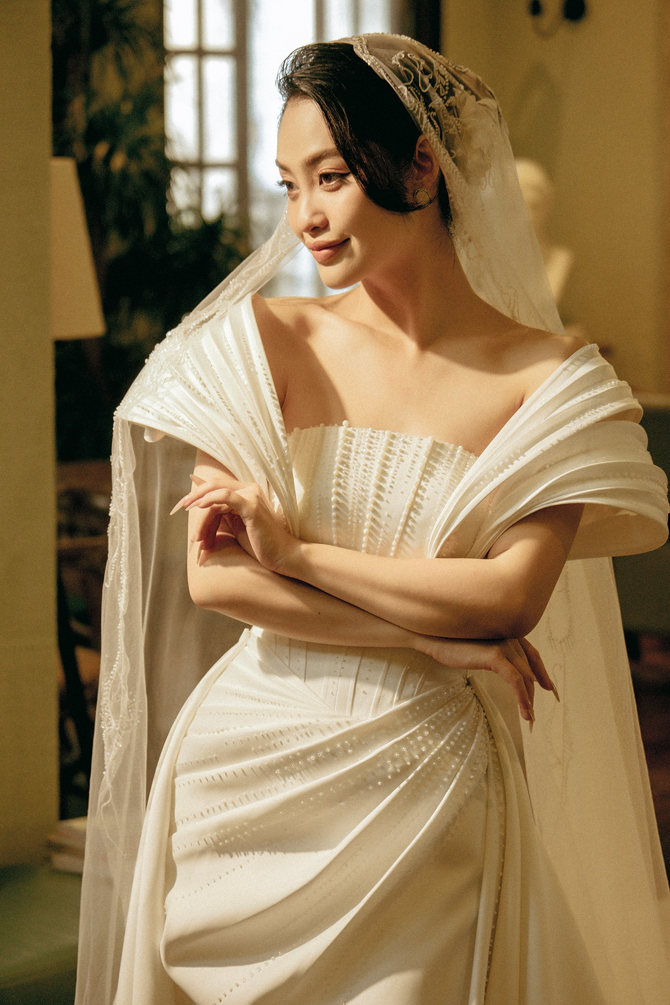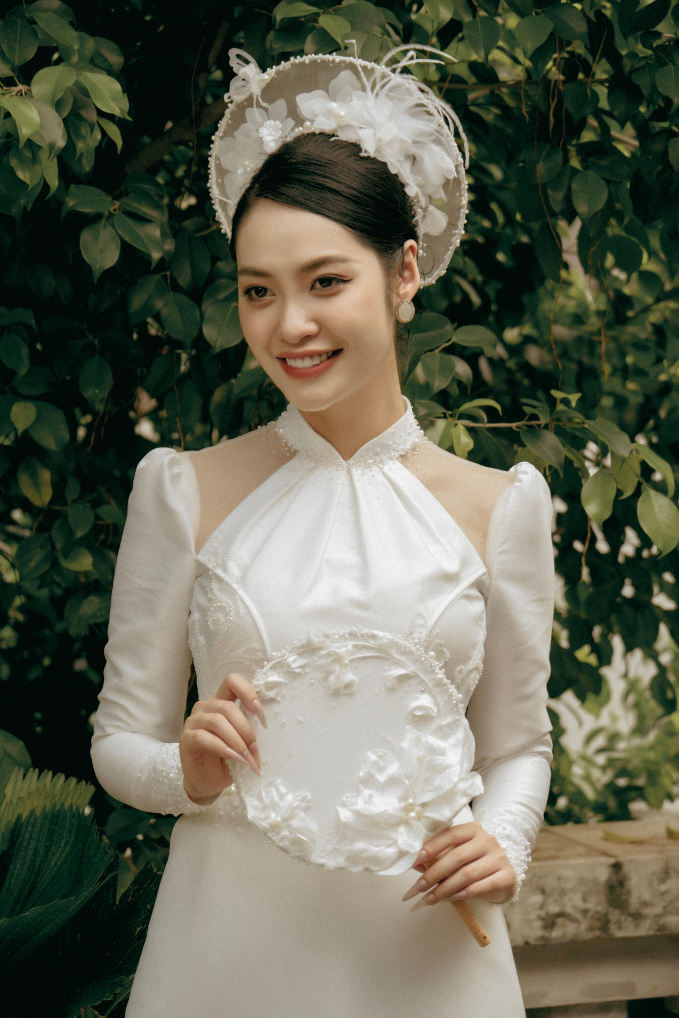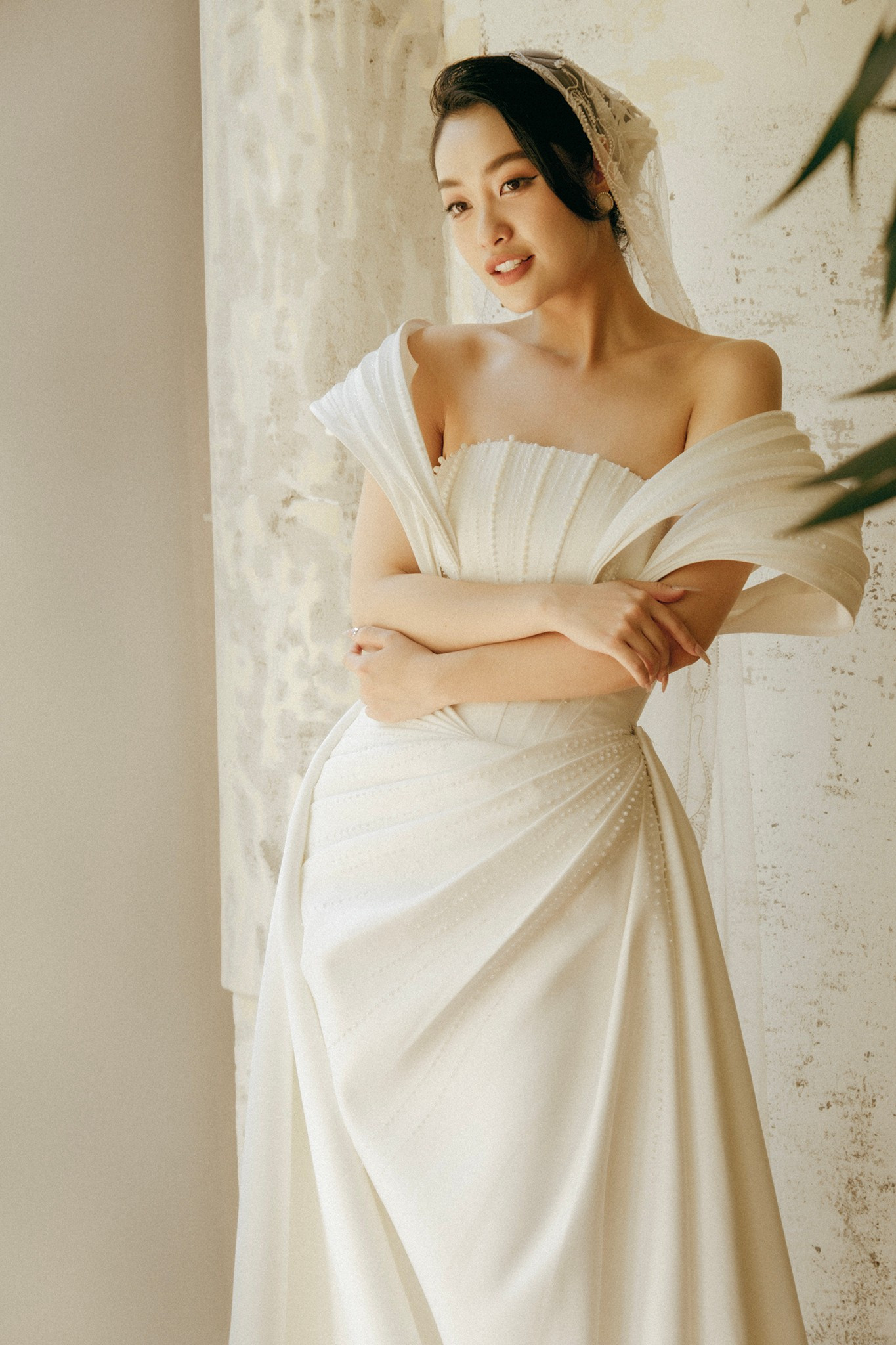 Nếu như trong thiết kế đầu tiên, các chi tiết gấp nếp 3D tạo phom váy sắc nét, hiện đại thì chiếc váy cưới thứ hai lại là sự kết hợp của phom áo dài với áo yếm mang đậm hơi thở truyền thống. 'Người đẹp' sinh năm 1999 chọn lối trang điểm nhẹ nhàng cùng tóc búi cao đơn giản. Nhan sắc tuổi 24 của 'mỹ nhân' Việt càng ngày càng trở nên mặn mà sau hơn một năm đăng quang.