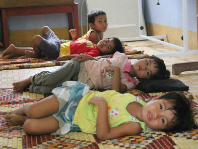 | Trải những manh chiếu rách để ngủ trưa, không có chăn, các em dùng áo lót làm gối. . |