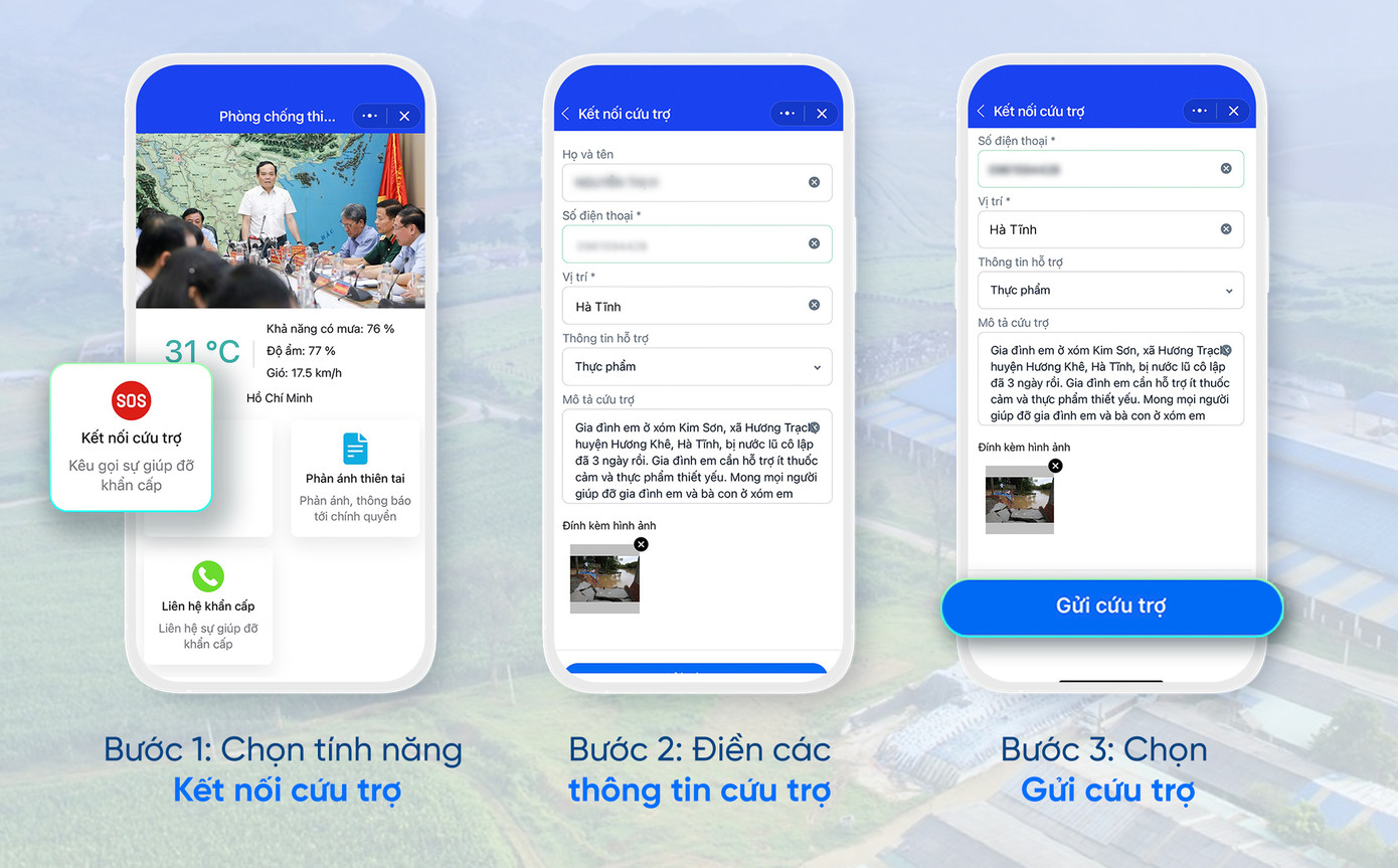 Trong tình huống thiên tai xảy ra, người dân gặp khó khăn như bị chia cắt do mưa lũ, bị cô lập trong tình trạng thiếu lương thực thực phẩm hoặc đang ở khu vực nguy hiểm cần hỗ trợ từ lực lượng cứu hộ... Người dân thực hiện các bước sau trên mini app: