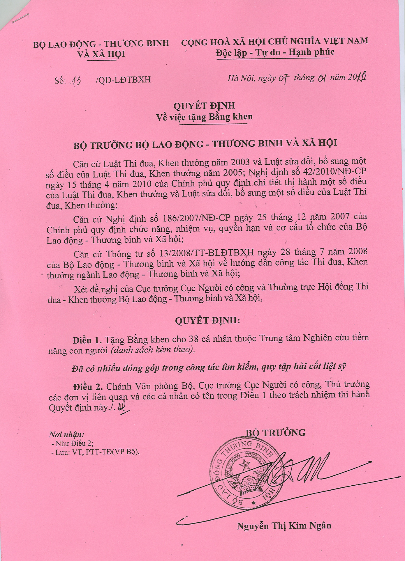 Do các thành tích đã đạt được, Bộ trưởng Bộ LĐ-TB&XH Nguyễn Thị Kim Ngân ngày 7-1-2011 đã ký Quyết định số 13/QĐ - LĐTBXH tặng Bằng khen cho 38 cá nhân xuất sắc và TTNCTNCN, ghi nhận đóng góp từ thế hệ mở đầu qua 20 năm hoạt động vì đạo lý “ăn quả nhớ người trồng cây” của dân tộc.